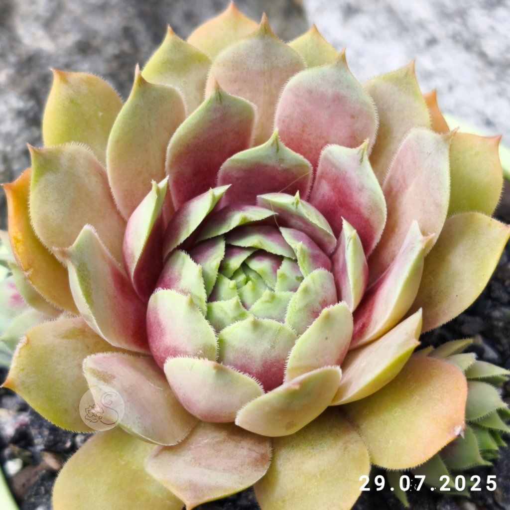 vytvára väčšie rozety v ružovofialových farbách. V lete sa vonkajšia časť listov zmení na pastelovo zelenú.