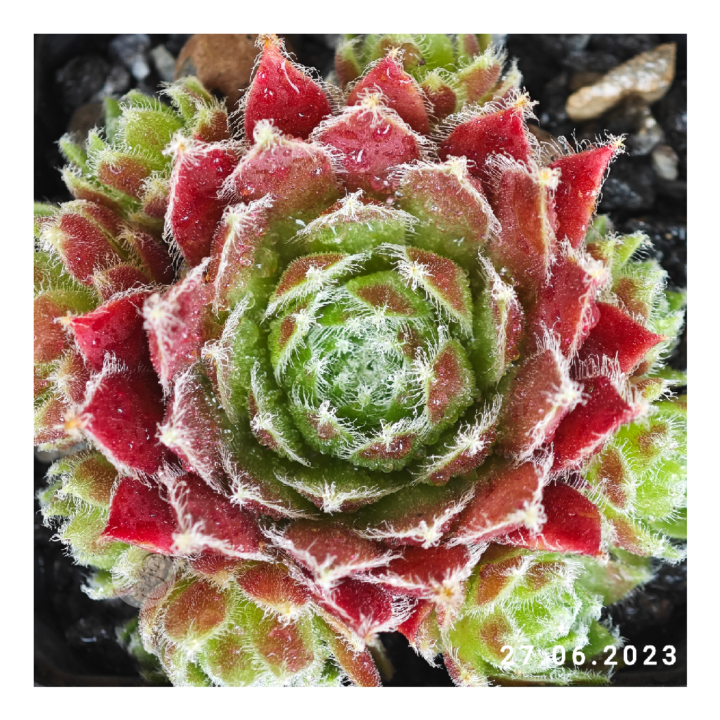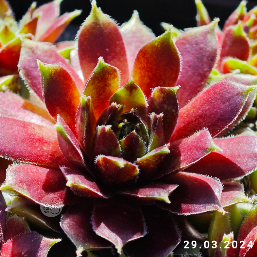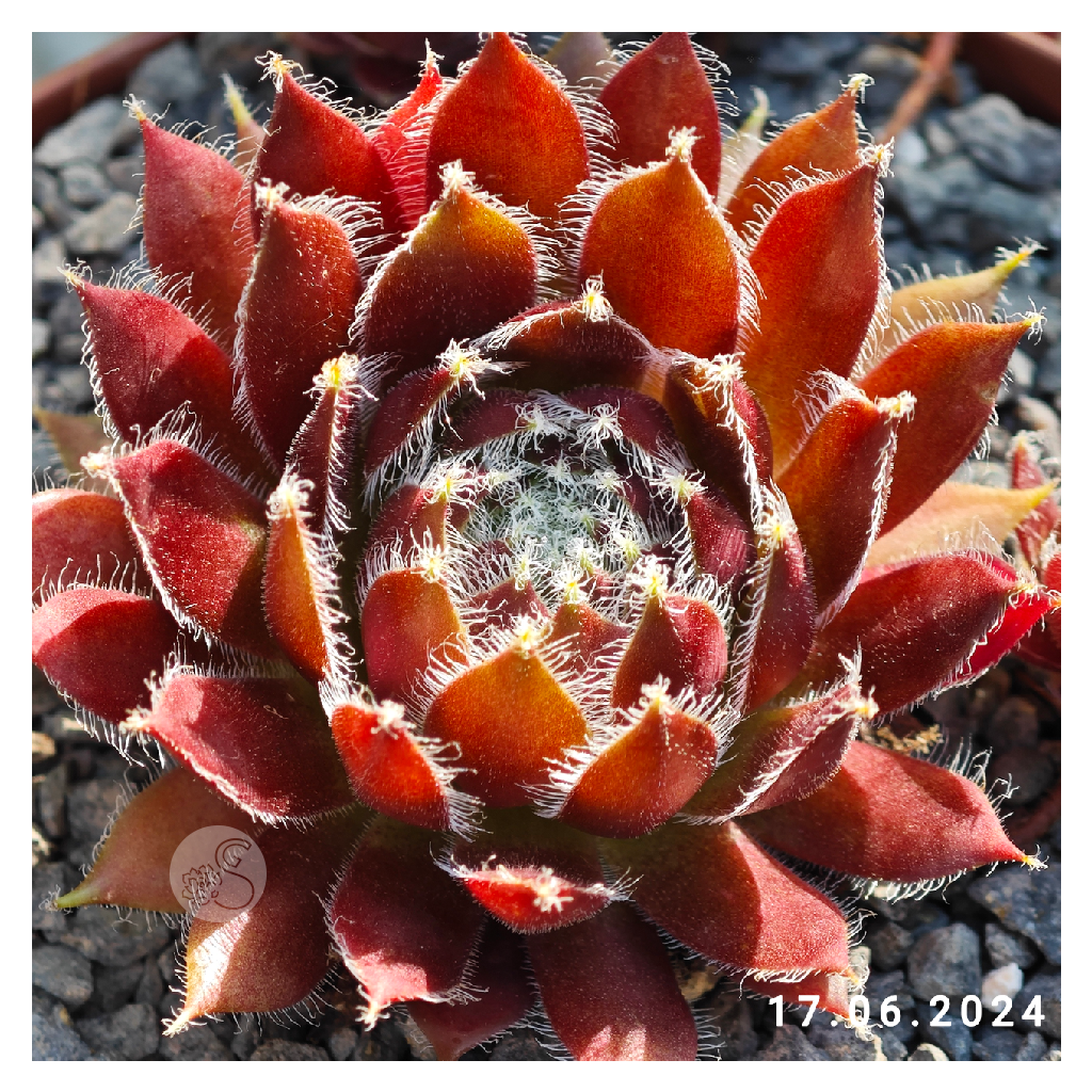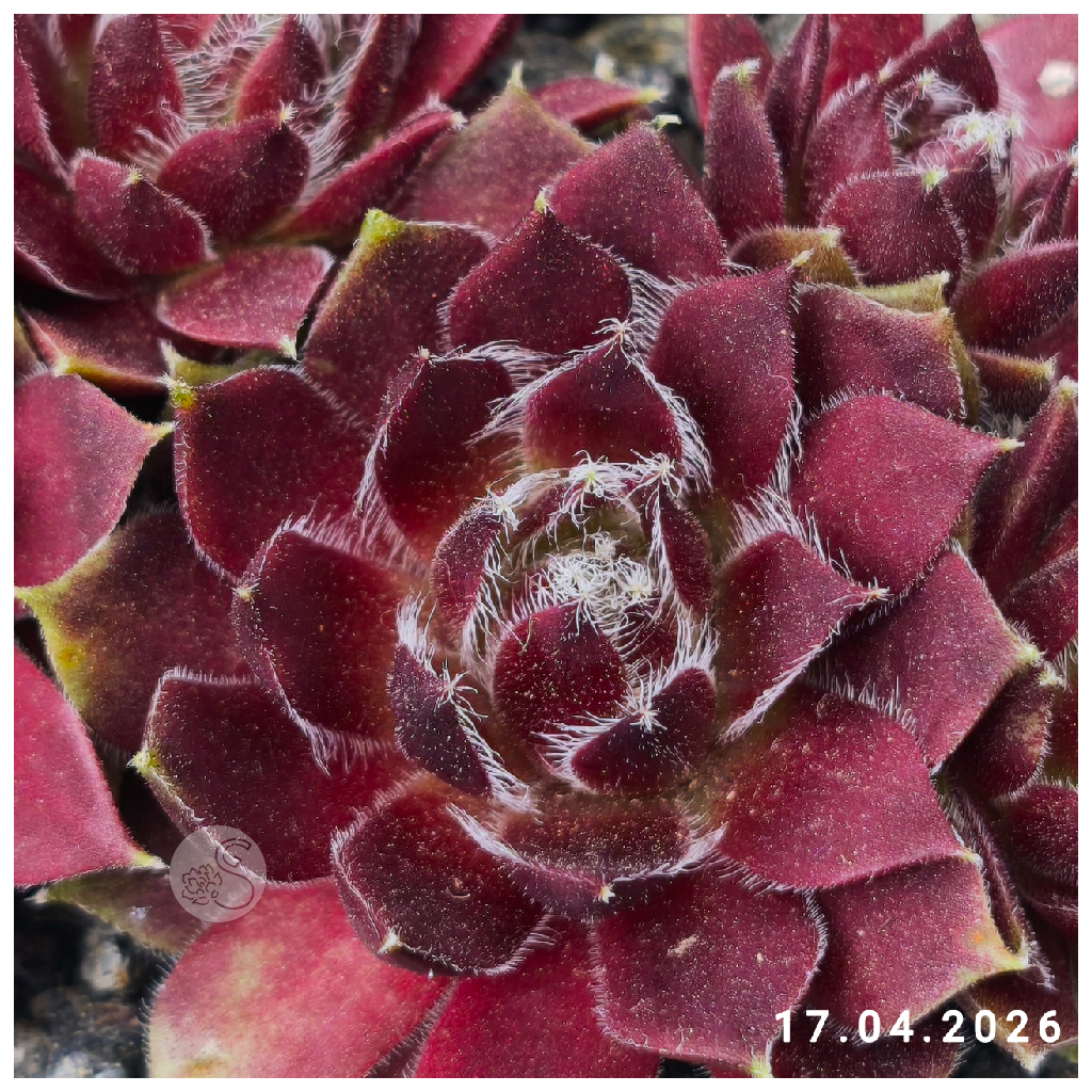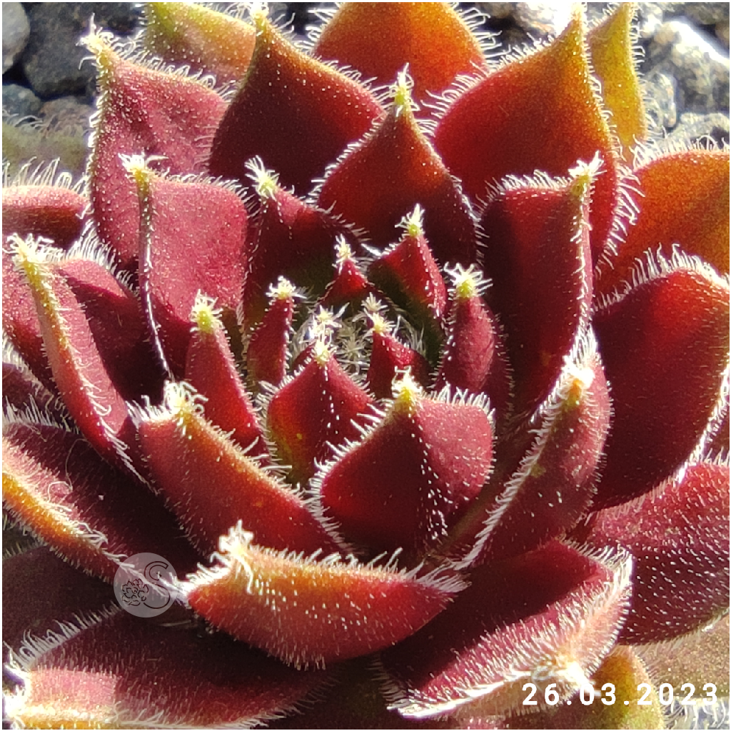 má menšie ružice s červenými jarnými listami. Špičky a okraje listov sú nápadne hrubé a husté, pokryté bielymi chĺpkami a riasinkami.